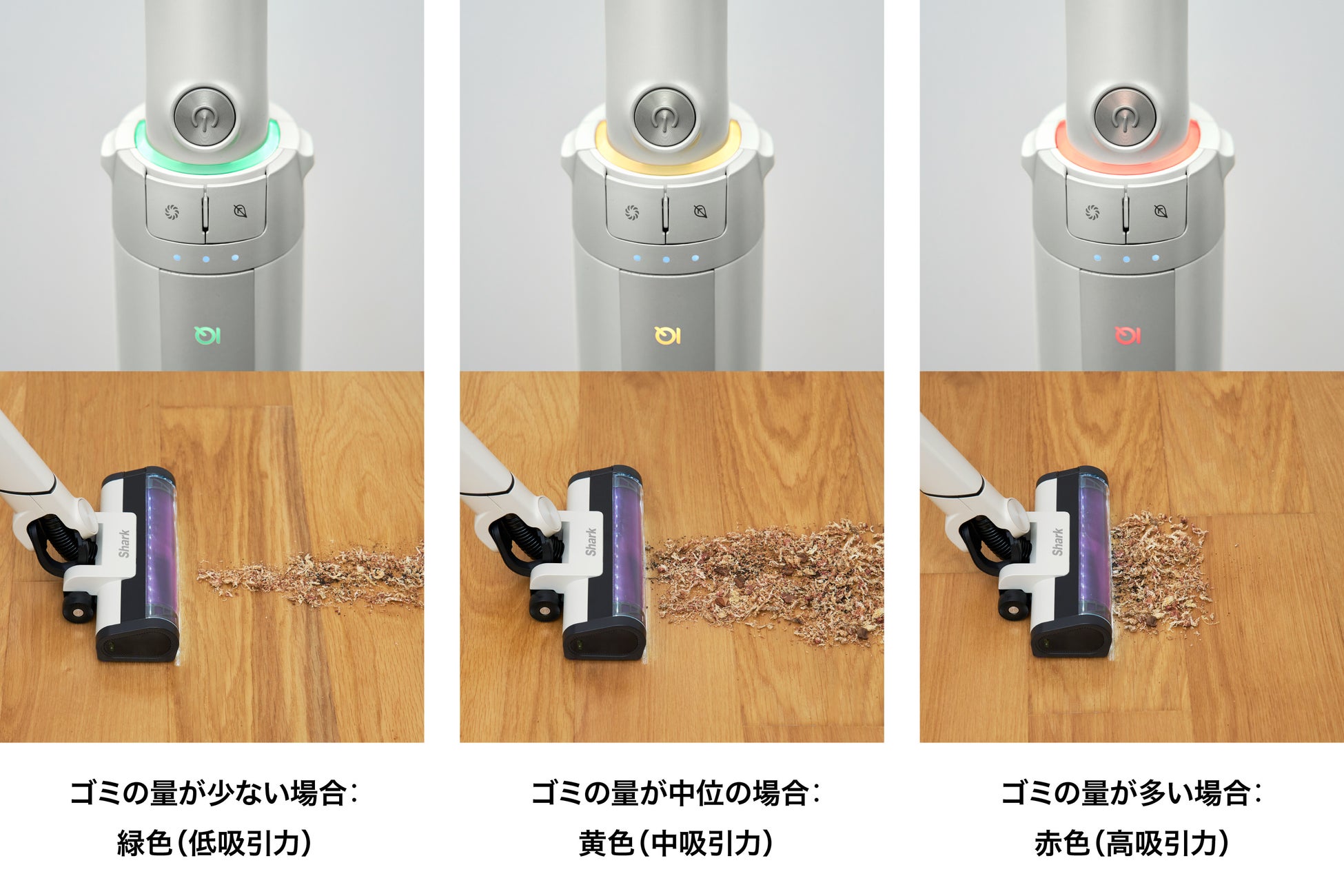 吸引するゴミの量に応じて、ハンディ上部の「iQリング」の色が緑色、黄色、赤色の3色に変化するので、見えないゴミも見逃さず、キレイになったことをひと目で確認できます。