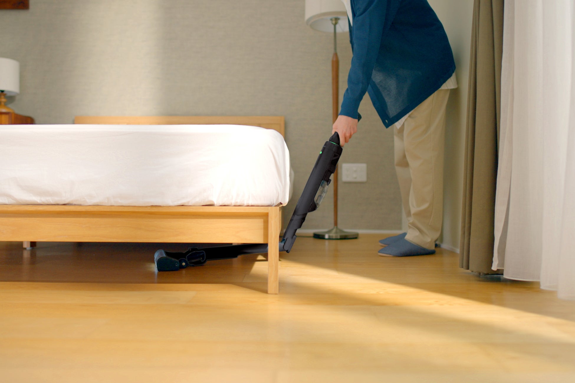ボタンひとつでパイプが曲がるFLEX(フレックス)機能を搭載しています。かがまず立ったままの姿勢で家具の下をスムーズにお掃除できます。家具前に十分なスペースがなくても、パイプが曲がるためしっかり奥まで入り込みます。ソファやベッド、テーブルや椅子といった脚付き家具の下のお掃除が一段と楽になります。