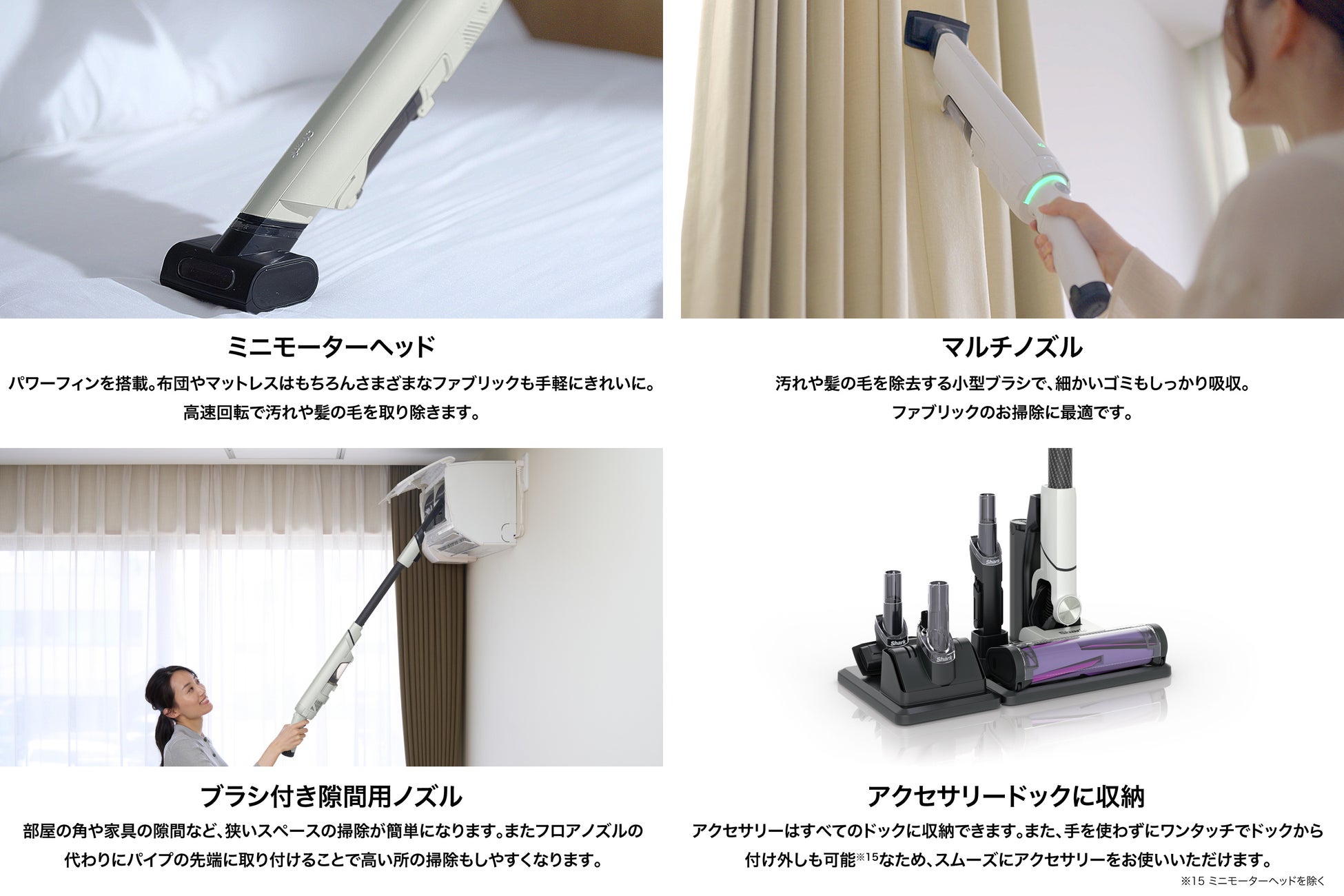 付属品 :ブラシ付き隙間用ノズル、マルチノズル、ミニモーターヘッド、アクセサリードック、
