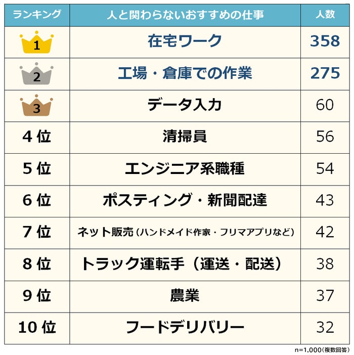 それでは、人との関わりが苦手な男女1,000人の選ぶ「人と関わらずにできるおすすめの仕事ランキング」を発表です。