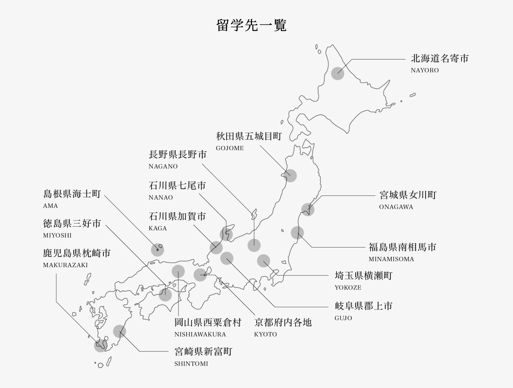 北海道名寄市、秋田県五城目町、宮城県女川町、福島県南相馬市、埼玉県横瀬町、石川県加賀市、石川県七尾市、長野県長野市、岐阜県郡上市、京都府京都市、岡山県西粟倉村、島根県海士町、徳島県三好市、宮崎県新富町、鹿児島県枕崎市