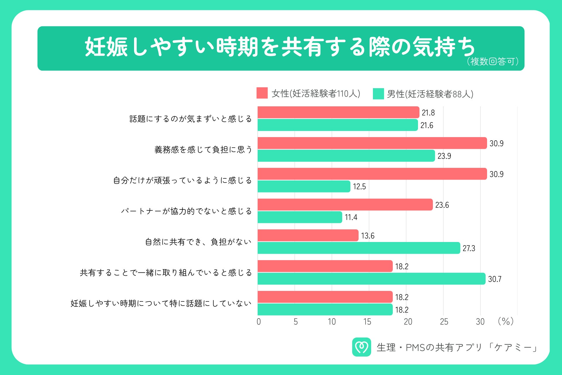 この結果から、妊娠しやすいタイミングを共有する際に、女性は「孤独感」を抱えやすい一方で、男性は「一緒に取り組んでいる」と捉えていることが分かり、夫婦間での心理的負担のズレがある可能性が浮き彫りになりました。