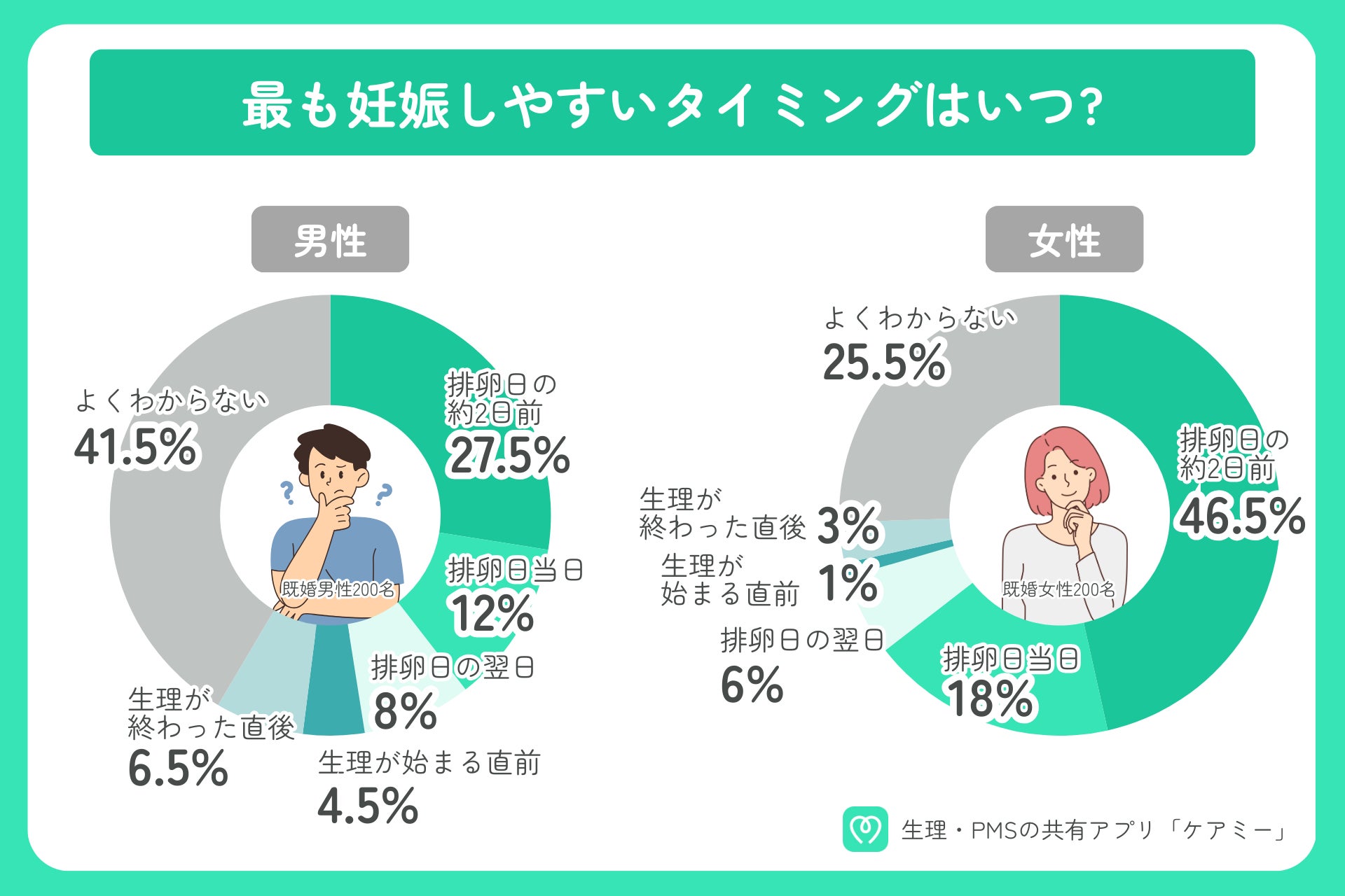 調査では、最も妊娠しやすいタイミングについて女性の46.5%が「排卵日の約2日前」と正確に認識している一方で、男性の正答率は27.5%にとどまりました。また、男性の41.5%が「よくわからない」と回答し、女性(25.5%)と比較して男性の知識不足が顕著であることが明らかになりました。