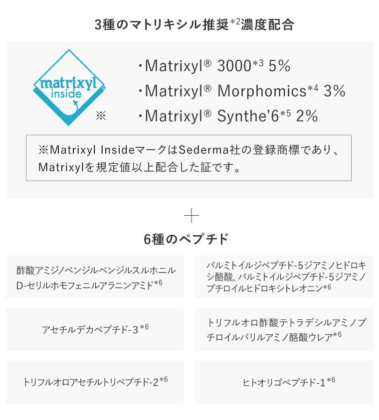 *1 当社比 *2 Sederma社 *3 パルミトイルテトラペプチド-7、パルミトイルトリペプチド-1(整肌) *4 酢酸N-プロリルパルミトイルトリペプチド-56(整肌) *5 パルミトイルトリペプチド-38(整肌) Matrixyl InsideマークはSederma社の登録商標であり、Matrixylを規定値以上配合した証です。 *6 整肌