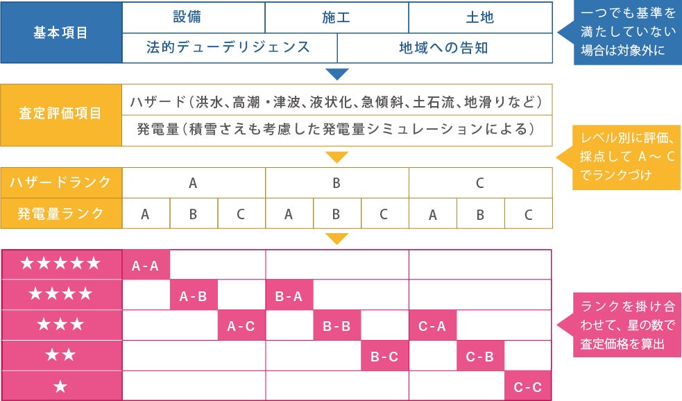 基準をすべて満たすことができた発電所は、ハザードマップなどを参照しながら評価する「ハザードランク」と、地域の積雪状況さえ計算に入れたエクソルの発電量シミュレーションによる「発電量ランク」をそれぞれ査定し、A ~ Cで評価します。最終的に、各項目の評価を掛け合わせて発電所を5段階評価し、査定価格を算出します。