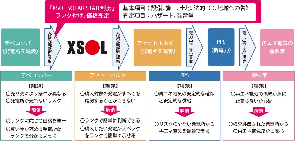 株式会社エクソル(代表取締役社長:鈴木 伸一、本社:京都市中京区、以下、エクソル)は、「XSOL SOLAR STAR 制度」の運用を開始します。「XSOL SOLAR STAR 制度」は太陽光発電所の設備、法的デューデリジェンス、ハザードや発電量などを検査・評価してランク付けし、価格査定するサービスです。