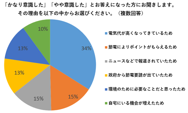 節電を「かなり意識した」「やや意識した」と回答した方にその理由を質問したところ(複数回答)、全回答数の約34%が「電気代が高くなってきているため」と回答。燃料価格の高騰による電気代の上昇(主に燃料費調整額の上昇)が結果として如実に現れました。また、約15%が「節電によりポイントがもらえるため」と回答し、「国の節電プログラム」※2に関する報道も背景となり、全体の約5割を家計に直結する要因が占める結果となりました。
