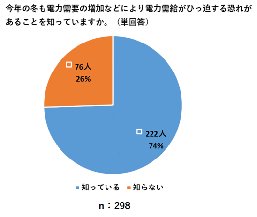 経済産業省資源エネルギー庁は、今年の冬の電力の安定供給に最低限必要な予備率は3%を確保できる※3としつつ、1月の東北・東京エリアでは予備率が約4%となるなど、依然として厳しい状況を予測しています。アンケート対象者においても約75%が今冬に電力需給ひっ迫の恐れがあることをすでに認識しており、家庭や企業に対する省エネ・節電喚起の必要性がこれまで以上に高まっています。