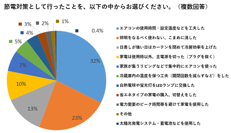 「節電対策として行ったことをお選びください」との質問(複数回答)に対しては、全回答数の約55%が「エアコンの使用時間・設定温度などを工夫した」「照明をなるべく使わない、こまめに消した」と回答し、夏場の節電対策としてエアコンや照明器具を工夫して利用することの有用性が広く認識されていることが明らかになりました。また、カーテンによる冷房効率向上のための工夫や、こまめな家電の電源オフなどの節電対策も上位を占め、身近なところから節電を工夫する姿勢が見受けられました。