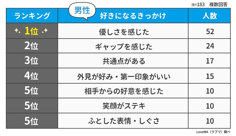 ■好きになるきっかけ|男性の回答数1位は「優しさを感じた」