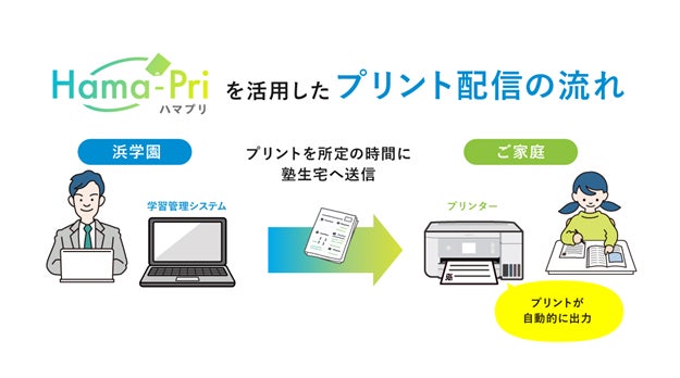 浜学園は自社で運営する「浜学園Webスクール」で、スタディラボとエプソンが2023年春からサービス提供を開始した「StudyOne(スタディワン)」と連携し、2024年3月から同スクール内で「ハマプリ」としてサービスを開始しました。「ハマプリ」は、塾と家庭をつなげる学習サービス「StudyOne」を活用したもので、プリント・テストなどの紙教材を、ご家庭に設置したプリンターにて自動で印刷(注)することが可能となります。これにより、これまで行っていた各生徒のご家庭に向けた郵送による紙教材の配送回数を削減することができ、今後国内で予想される輸送能力の不足に備えると共に、タイムリーに家庭学習を行うことができる利便性が高いサービスを実現し、「浜学園Webスクール」を受講している生徒へより質の高い教育環境をご提供します。