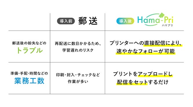 「ハマプリ」の導入により、学習専用プリンターが各家庭に設置され、浜学園からのプリントを一斉配信することで郵送のための印刷・封入・チェックなどの手間を省き、同時に教材配布のリードタイム短縮および業務工数の削減を実現しました。また、プリンターへの直接配信により、ご家庭でもタイムリーに学習を行うことが可能になると同時に、紛失など郵送後のトラブルが回避され、塾・ご家庭双方の負担を軽減しました。