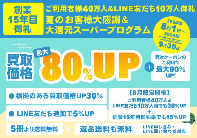 《夏のお客様大感謝・大還元 スーパープログラム開催》買取額が「最大80%アップ」になる!!【ご利用者様40万人&LINE友だち10万人&創業15周年御礼企画】