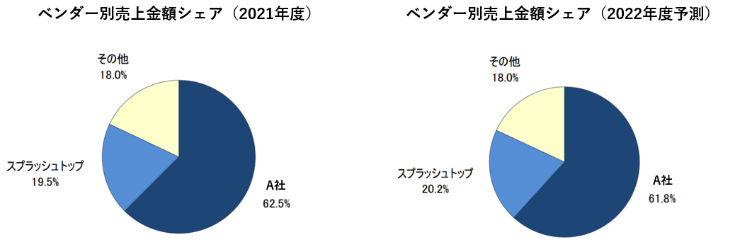 2021年度のリモートワーク用途リモートデスクトップ/リモートコントロール市場の内、スプラッシュトップのベンダー別売上金額シェアは19.5%となり、2020年度比で、8.6億円から9.9億円となり、115.6%増と大きく業績を伸ばしました。