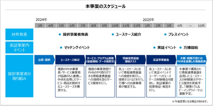 今後、ユースケースの具体化および情報連携基盤との接続を進め、2025年2月には、ユースケースを体験・評価する実証イベントを開催する予定です。また2025年4月以降には、創出されたユースケースの国民の体験機会を万博で設けることでPHRサービス利用者の拡大を目指します。