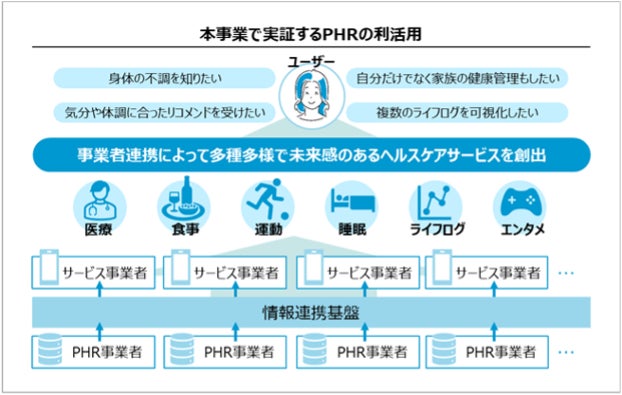 本事業期間には、運動、睡眠、食事等の各テーマにおいて、PHR事業者及びサービス事業者の協調のもと、情報連携基盤を介したPHRを活用したユースケースを提供する仕組みを実証的に実現します。