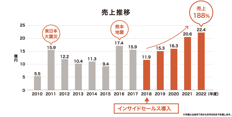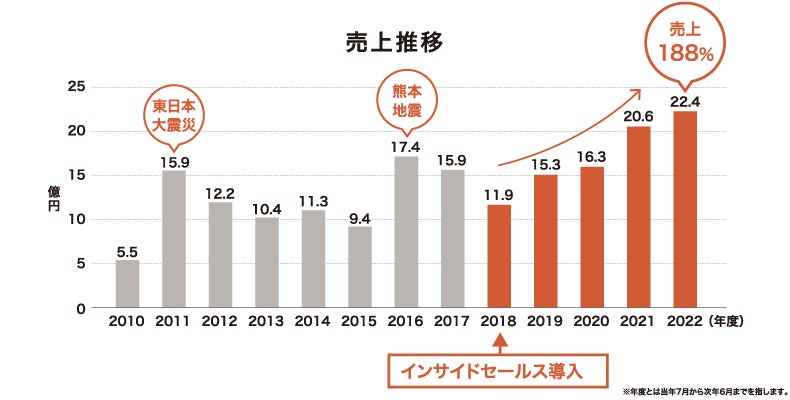 以前は、地震等の復興需要に売上が左右されてしまう不安定な経営でした。震災需要に頼らない組織を創り上げるために、2018年にインサイドセールスを導入しました。外部のコンサルを入れることなく、データ分析や主要メンバーとのコミュニケーションから表面化される機会損失に対し地道な改善を積み重ねることにより、復興需要に頼ることなく、またコロナ禍においても継続的に売上を伸ばすことができています。