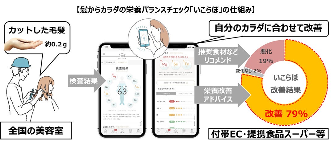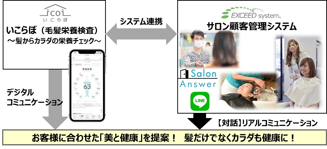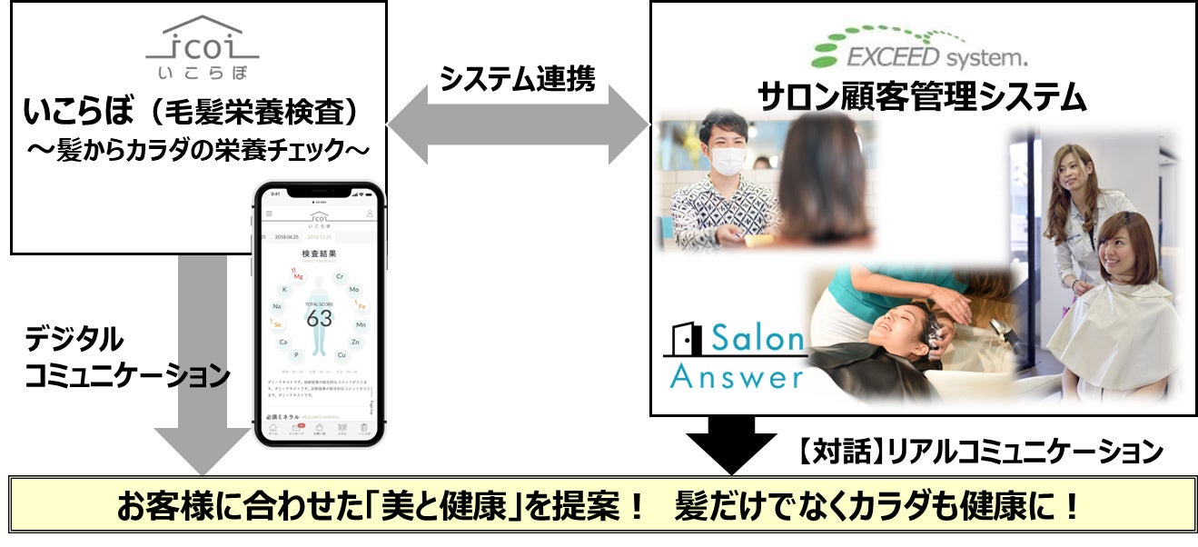 「いこらぼ(毛髪栄養検査)」は、髪の毛からカラダの栄養バランスがチェックできるサービスで、当連動によりサロン情報インフラを通して、顧客の来店タイミングに健康課題や改善ポイントなどを伝えてゆくことが可能となります。美容師のリアルコミュニケーションも活用することで、顧客のさらなる健康増進や未病対策につなげてゆくことが目的です。