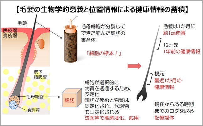 毛髪は、毛包から生み出され毛母細胞が分裂してできた細胞に、ケラチンが蓄積して線維化したものです。そのため毛髪は固定化された細胞の集合体、いわば細胞の標本です。さらに、頭髪は月に約1cm伸びるので、根元から1cmのところには1カ月前の、12cm先には1年前のからだの細胞の情報が詰まっています。
