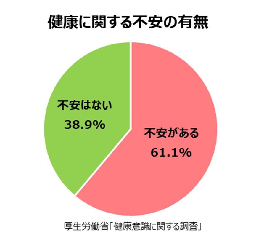 厚労省「健康意識に関する調査」(右グラフ)によると、健康に関して不安を持っている人は61%と過半を占めております。