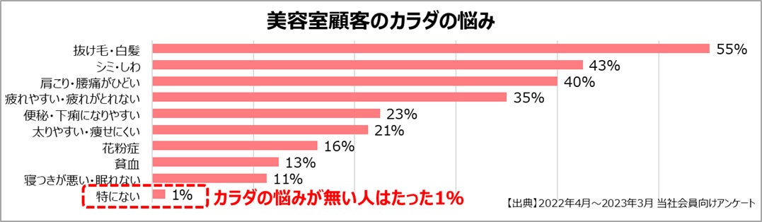 また、当社会員アンケート(下グラフ)では、具体的なカラダの悩みをきいてみたところ、悩みがない人はたった1%とほぼ全員がなにかしらの健康課題を抱えていることがわかっております。