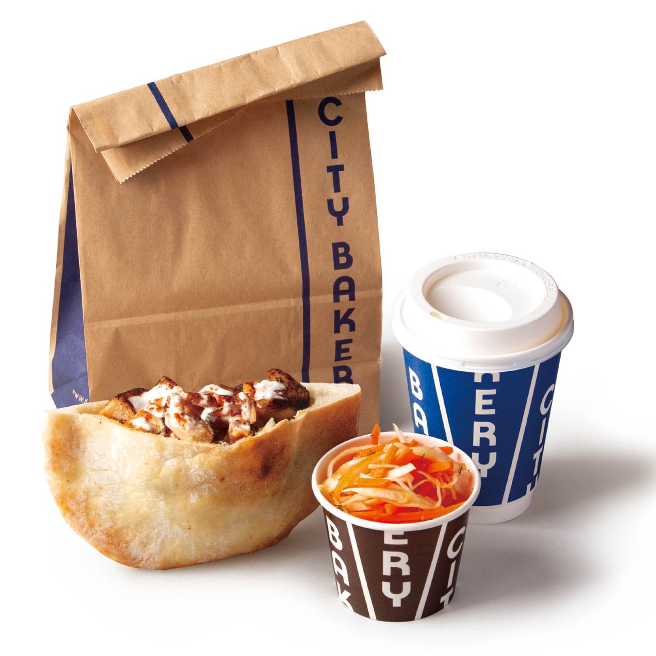 ピタサンド、ミニデリ、ドリンクのセット。お肉や野菜をバランスよく食べられる◎