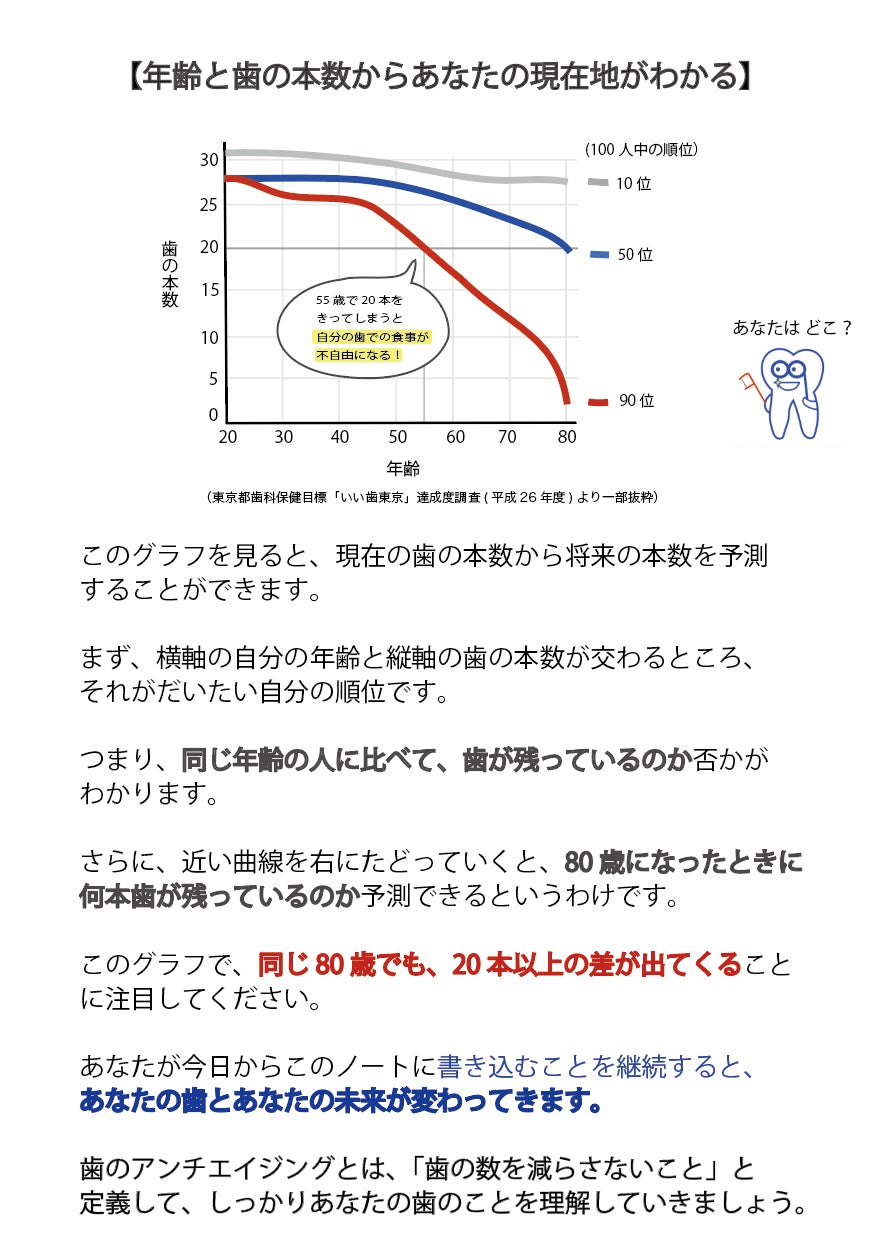 「この歯ってこんなに悪かった?」「自分の歯ってどれだけ残ってる?」「歯磨きで注意しなければいけないのはどの歯?」 など、気になる人向け。 自分の体なのに、実は把握していないことが多い「歯」。それもそのはず。 大人の9割の人がむし歯になったことがあり、40代・50代になると治療のやり直しが増えていき、自分の口の中がどうなっているのかさっぱりわかっていない人に役立つノートに仕上がりました。