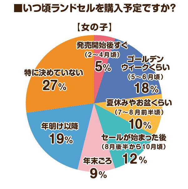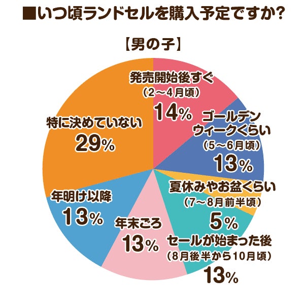 いつ頃ランドセルを購入予定ですかという質問に対しては、男女ともに最も多かったのが「特に決めていない」でした。