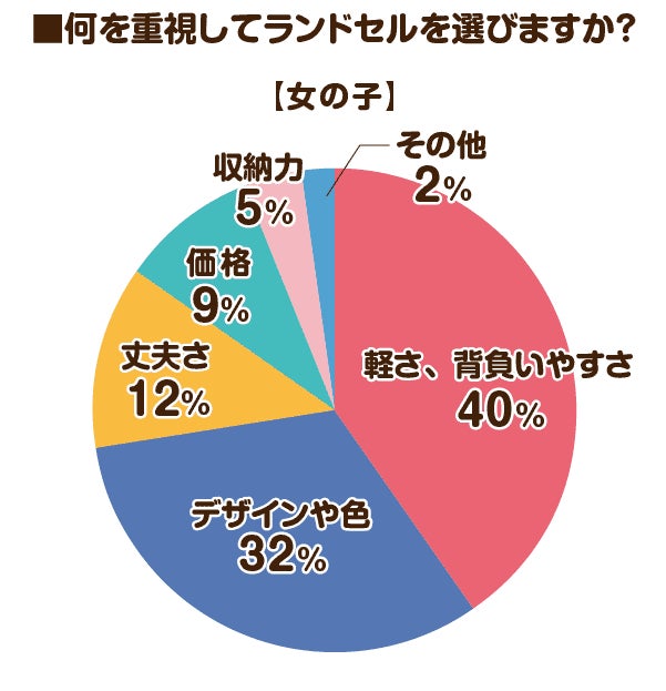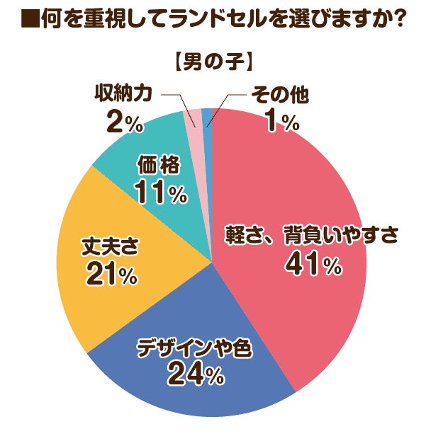 何を重視してランドセルを選ぶかという質問に対しては、男女ともに「軽さ、背負いやすさ」が1位でした。