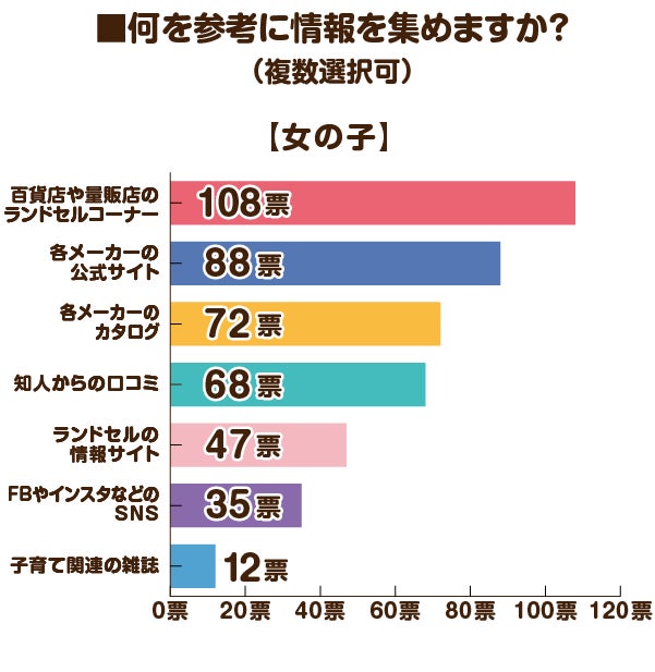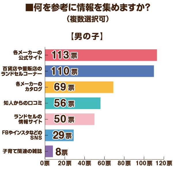何を参考に情報を集めますかという質問に対しては、「各メーカーの公式サイト」と「百貨店や量販店のランドセルコーナー」が上位となりました。