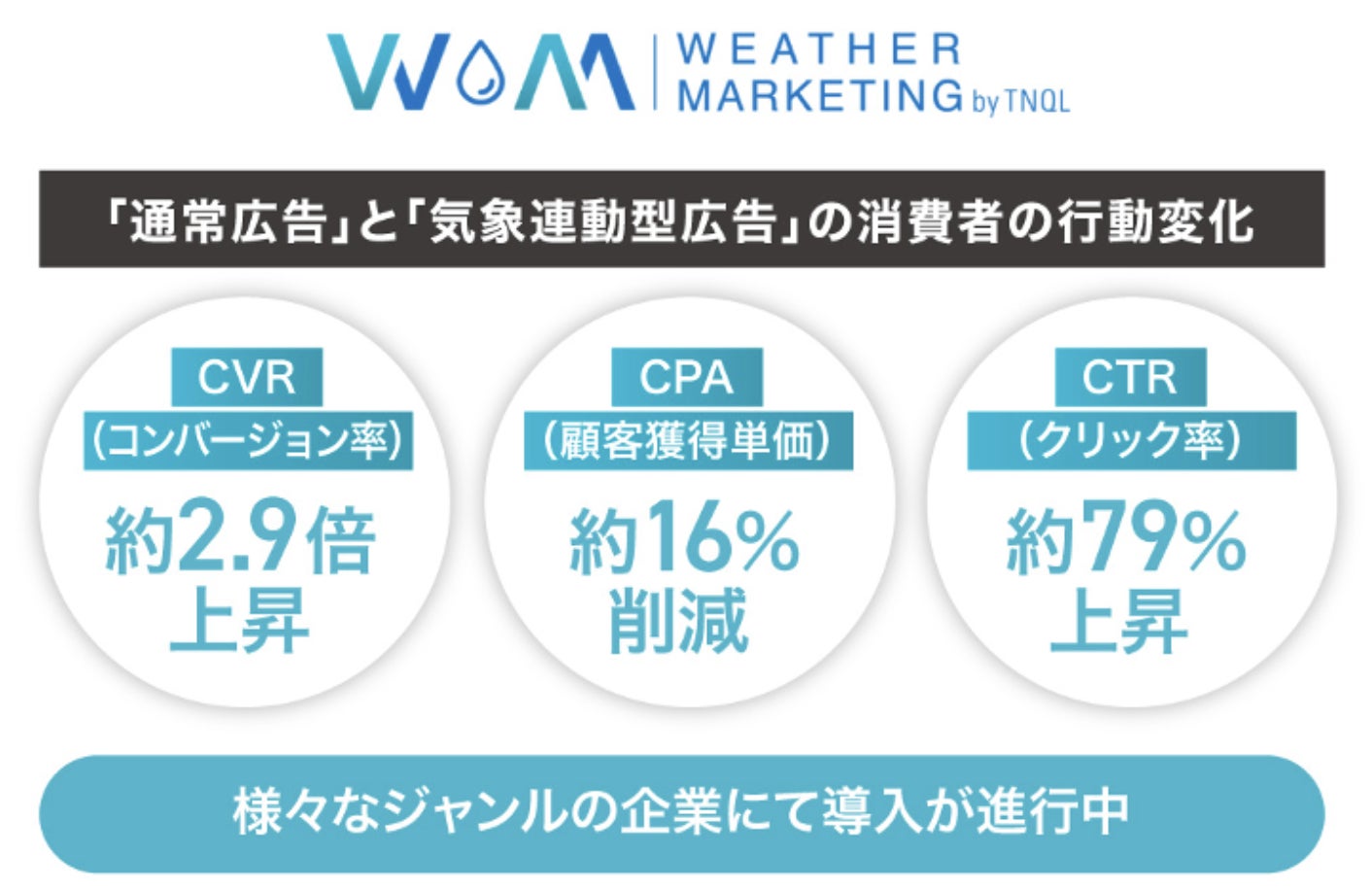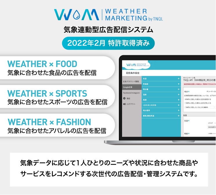 「weathermarketing.net」は、ルグランの20年に及ぶ運用型広告の管理・最適化の経験と、2017年のサービス提供開始以来、累計約25万人が利用した気象連動型コーディネート提案ツール「TNQL(テンキュール)」で培われた気象データ活用の知見の融合することで開発された、画期的な広告配信システムです。