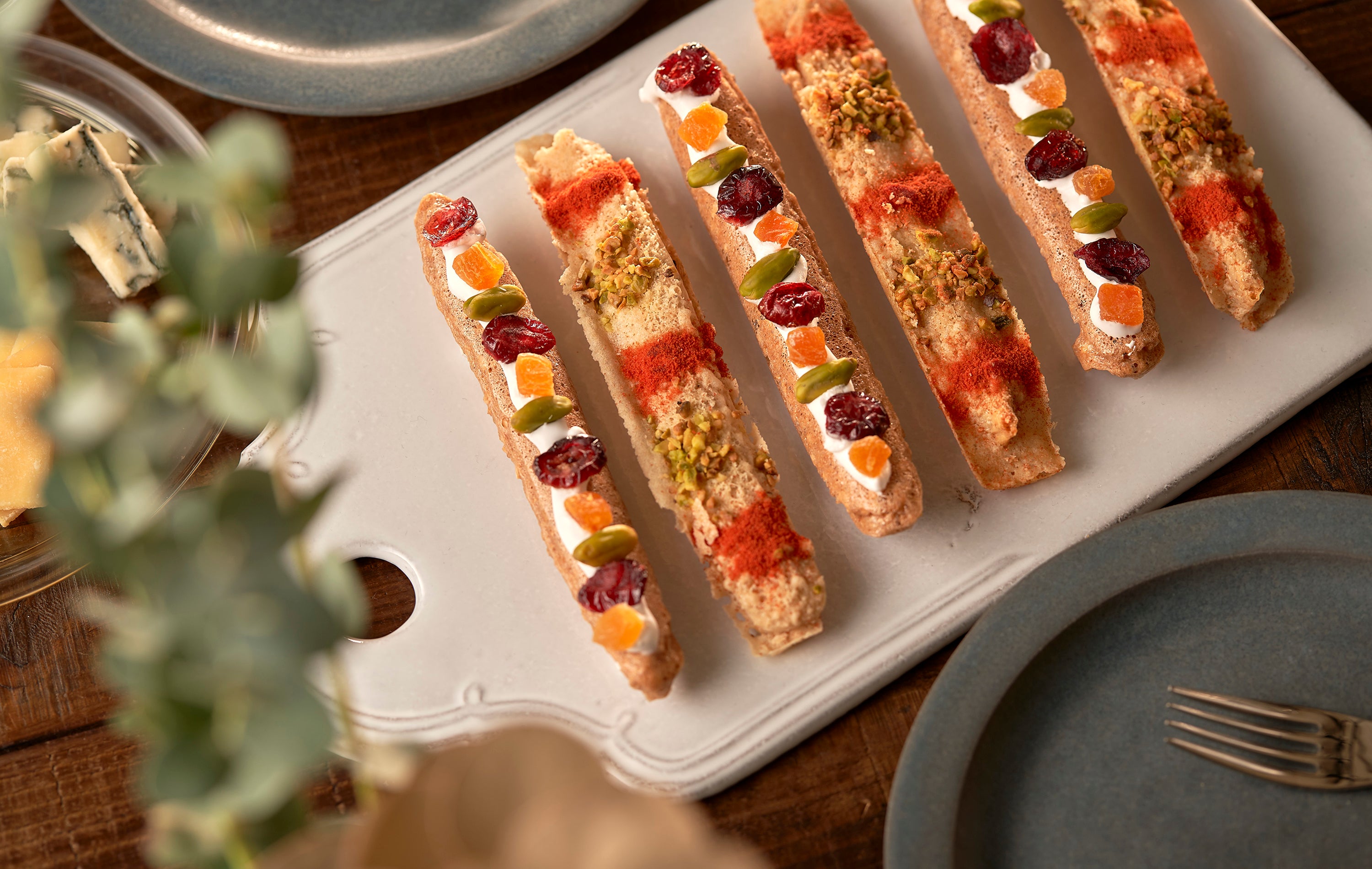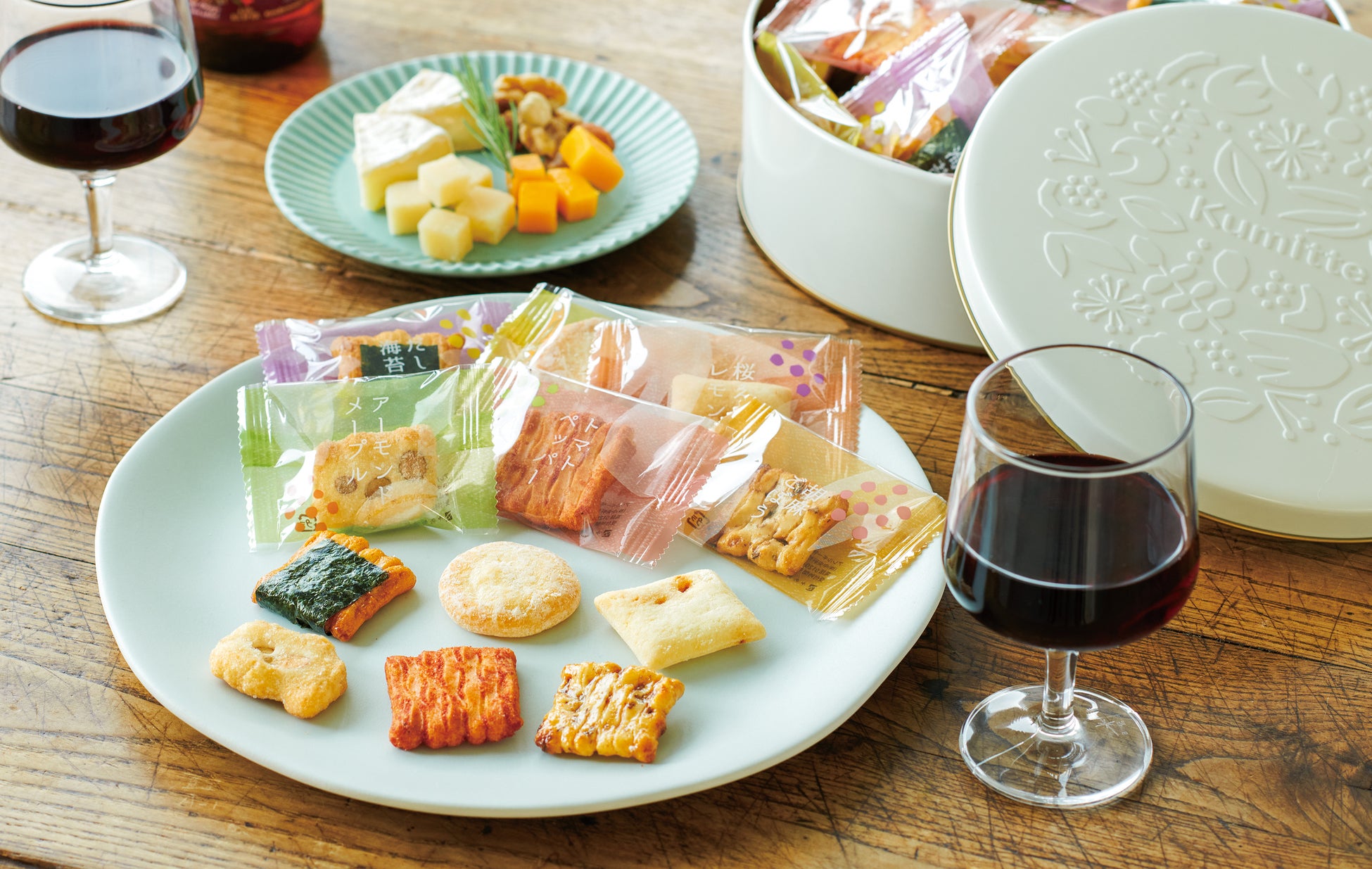 シナモンやドライフルーツ、マシュマロを使った、スイーツにようなおかきの「ドライフルーツ&ナッツ」、パルミジャーノレジャーノチーズ、ピスタチオとトマトの酸味がアクセントになった「パルミジャーノレジャーノ」。パルミジャーノレジャーノチーズをふんだんに使った、ワインやカクテルなどお酒にも合うおかきです。