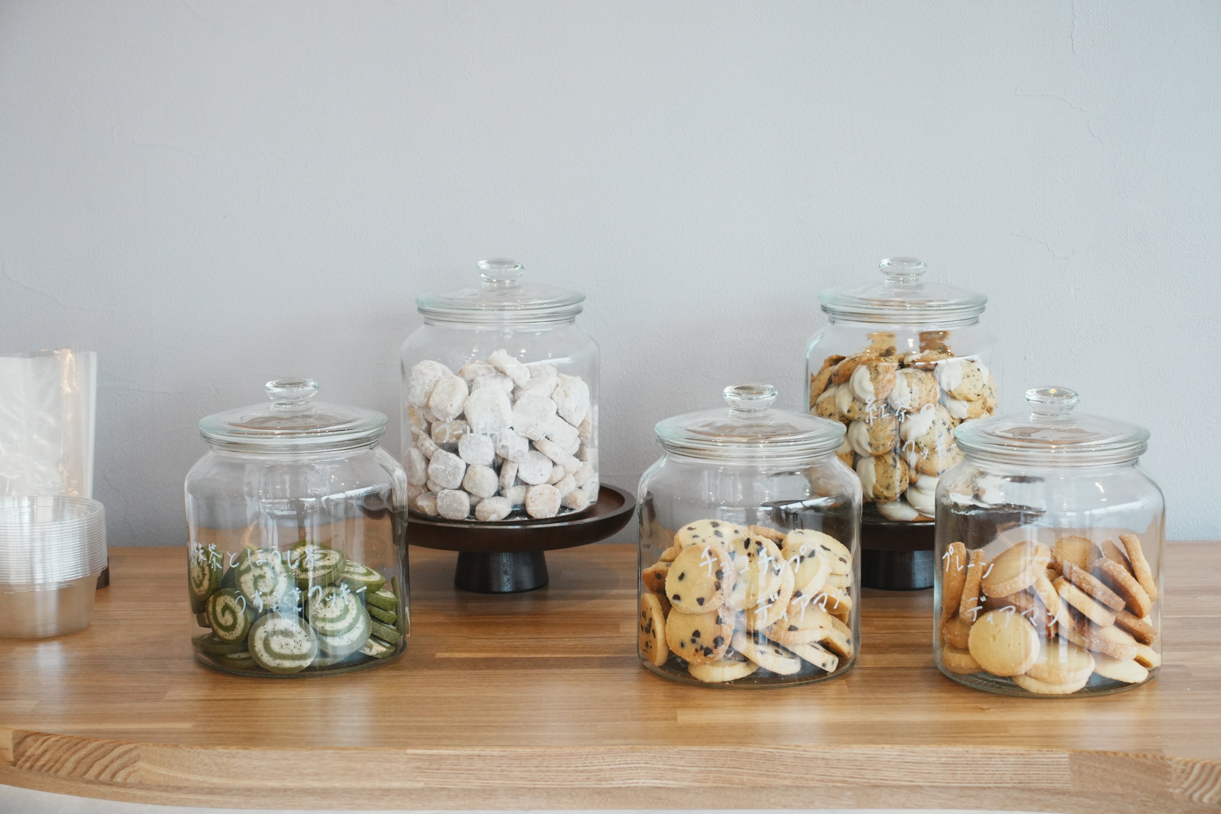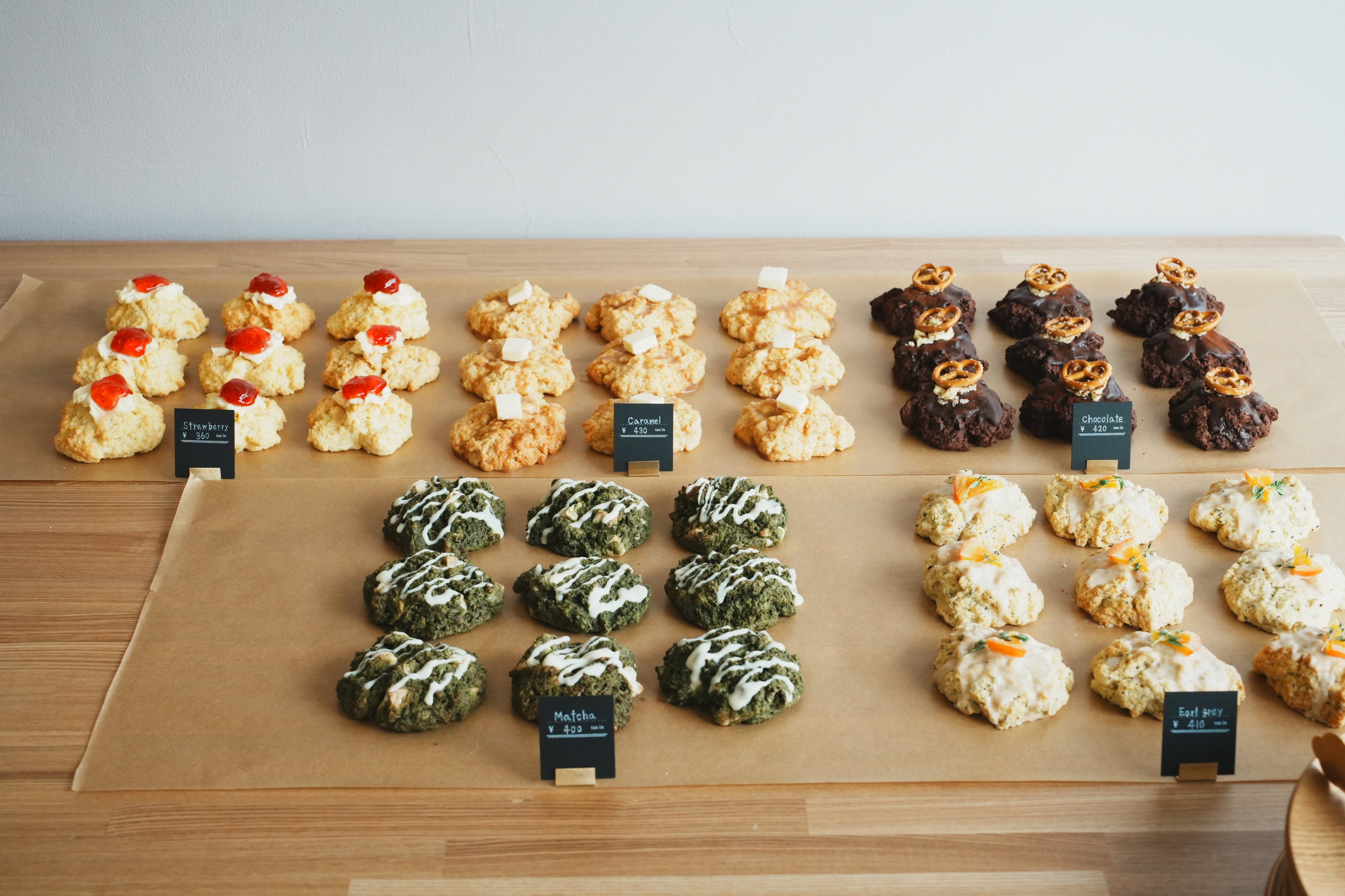 オープンから最初の半年間は、スコーンを主力商品として販売しています。半年後には新たな主力スイーツへと切り替える予定です。量り売りクッキーおよびドリンクは、定番メニューとして継続販売します。