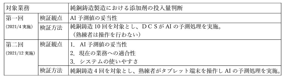 実際に純銅鋳造を行い、添加剤の投入量に関してAIの予測と熟練者の判断を比較します。熟練者は、AIの予測値に問題がないと判断した場合、AIの予測値通りに添加剤を投入します。
