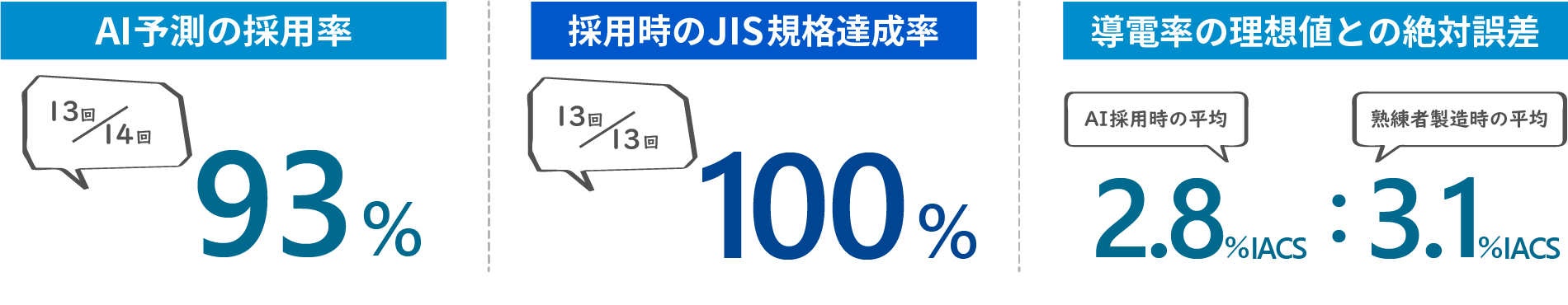 AIの予測値は、全14回の製造中13回で採用され、いずれの回もJIS規格を無事達成しました。