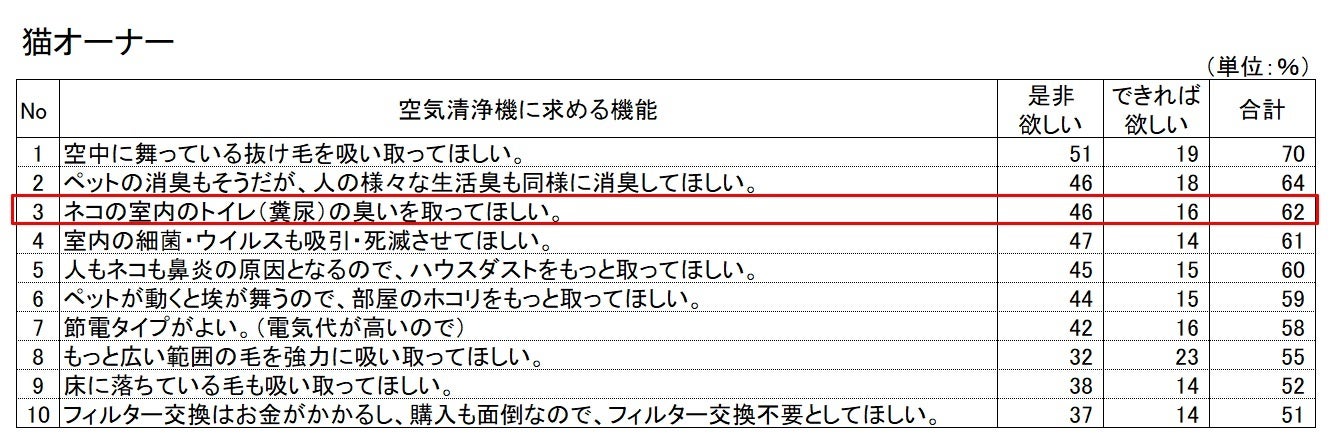 猫オーナーは、犬オーナーよりも空気清浄機に「抜け毛対策」を期待している方が多いです。
