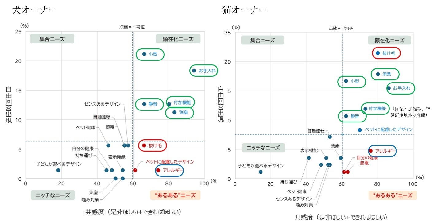 アレルギーに関するニーズとして、「ペットが室内を動きまわって舞い上がる埃を吸い取ってほしい」や、「ペットについているダニ、花粉、フケなどを吸い取ってほしい」といった声が、犬、猫のオーナーともに上がりました。