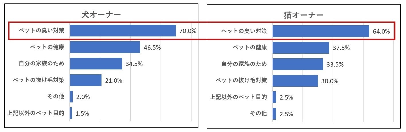 空気清浄機を買った目的としては、犬オーナー、猫オーナーともに一番は「ペット臭の臭い対策」、二番目は「ペットの健康」、三番目は「自分や家族のため(コロナ対策、タバコのにおい対策など)」という結果でした。