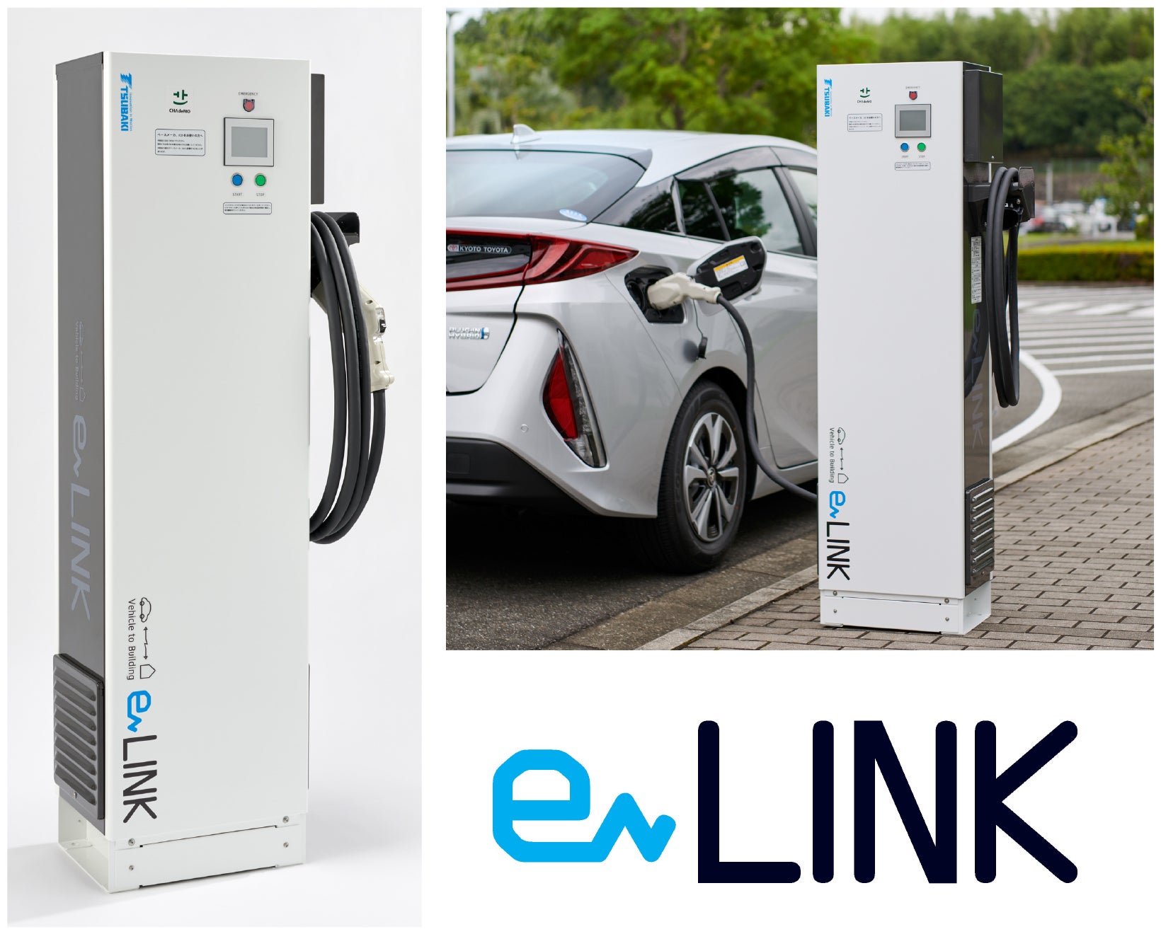 「eLINK」は、電気自動車(EV、PHEV)の大容量バッテリーから取り出した電力と、電力網を双方向につなぎ、停電時には非常用電源として、平常時には系統への給電(連系)やEVへの充電をスマートに制御できる事業者向けV2X対応充放電装置です。