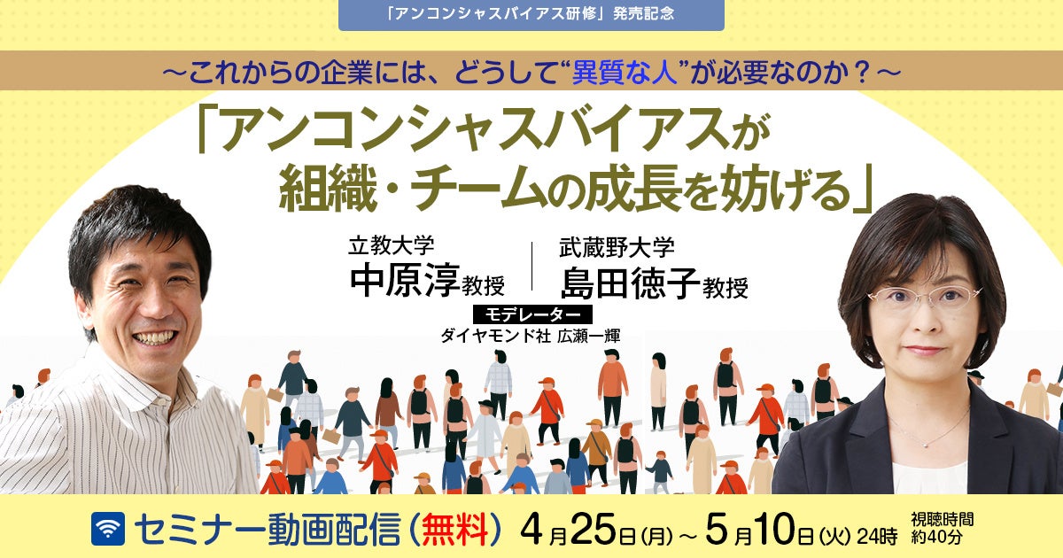 ダイヤモンド社では、立教大学の中原淳教授、武蔵野大学の島田徳子教授の監修による「アンコンシャスバイアス研修」の発売を記念し、両教授による無料オンデマンドセミナーを公開いたします。