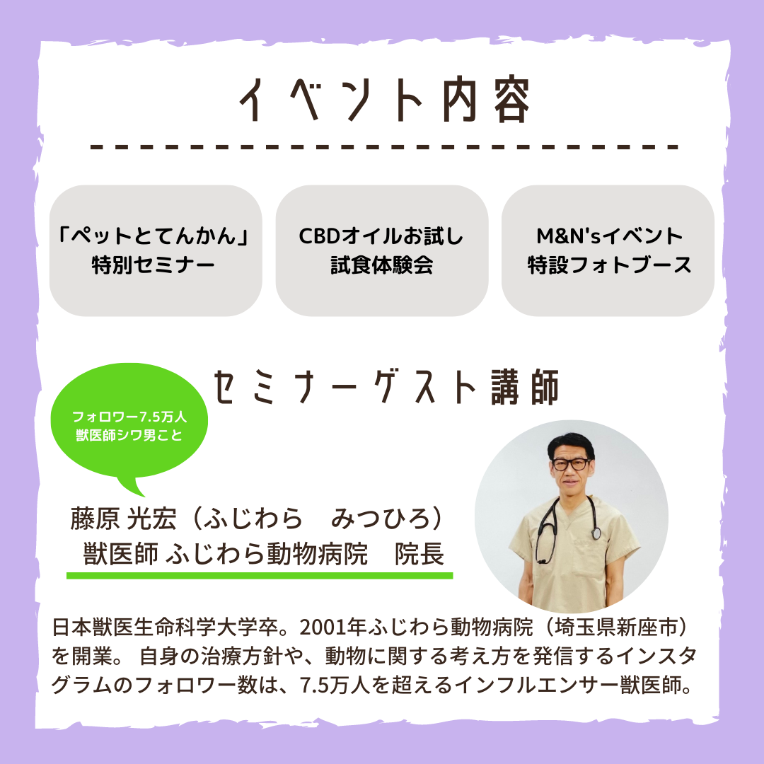 株式会社ウェルファーマ(東京都渋谷区)は、ペット用CBDオイルM&N'sのブランドにて、インスタグラムフォロワー7.5万人のインフルエンサー獣医師「シワ男先生」こと、ふじわら動物病院(埼玉県新座市)院長 藤原光宏先生をお招きし、「ペットのてんかんについて」をテーマとした限定イベントを開催いたします。