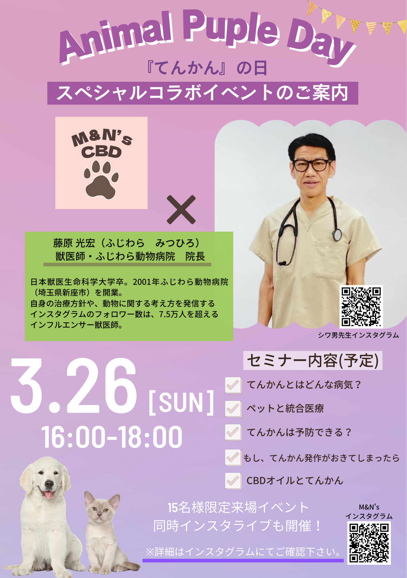 3月26日は世界てんかんの日。M&N's CBDでは、インスタグラム7.5万人フォロワーのインフルエンサー獣医師シワ男先生をお招きして、「ペットとてんかん」について知る限定イベントを開催いたします!