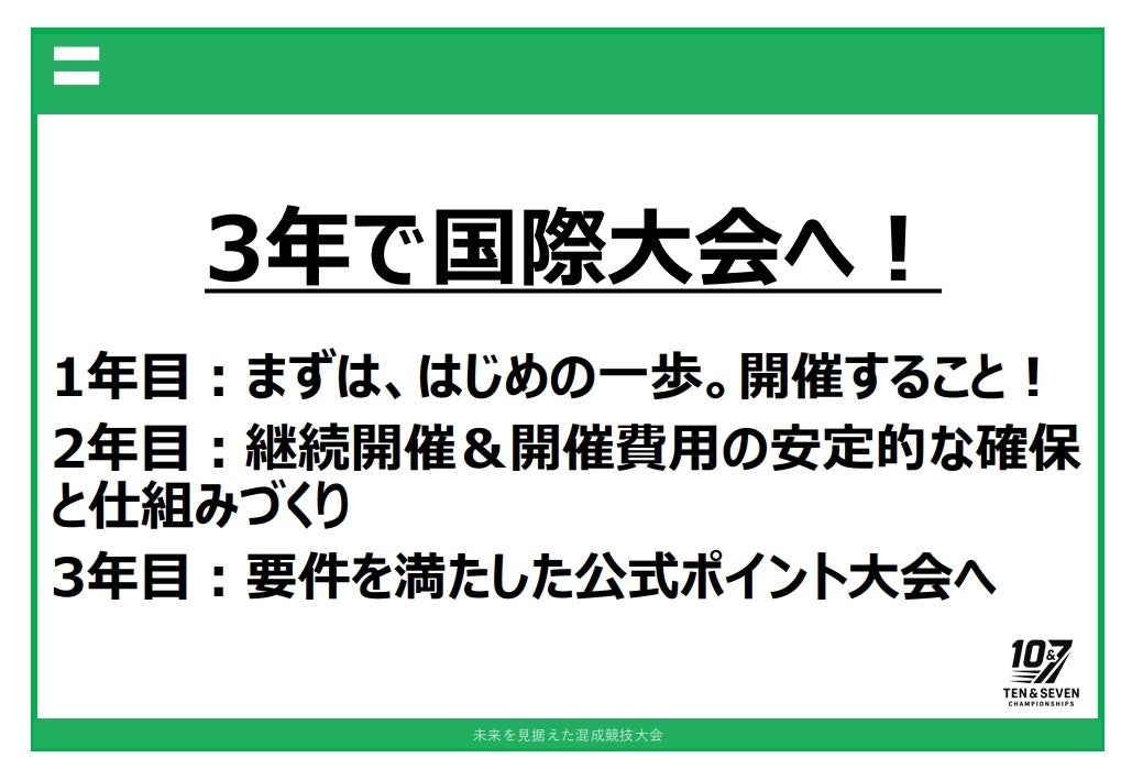 こうした現状を打破し、混成競技を継続的に発展させる場をつくることを目的に、「10&7 Championships」の創設に至りました。