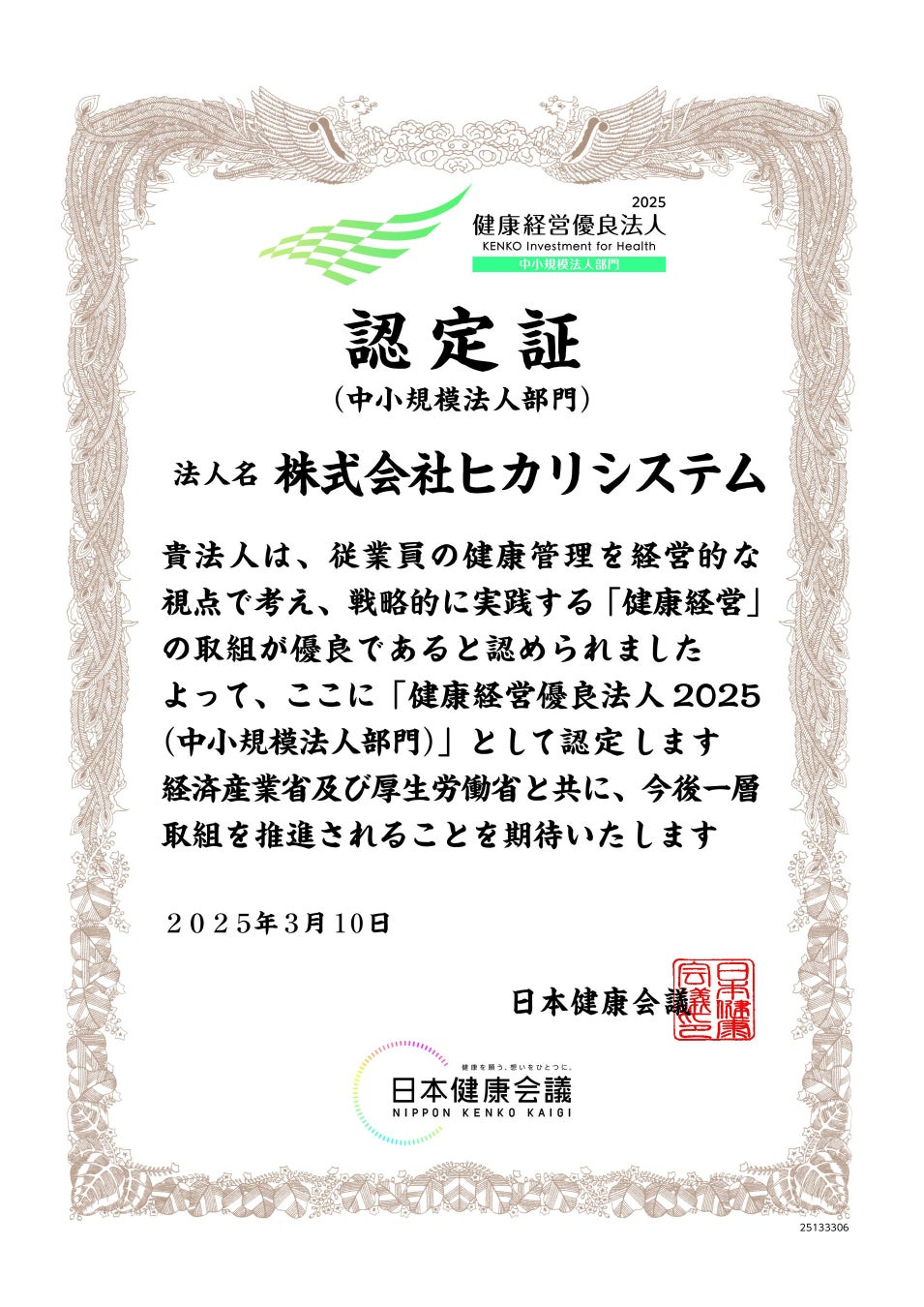 株式会社ヒカリシステム(本社:千葉県千葉市稲毛区、代表取締役 金光 淳用)は、経済産業省と日本健康会議が共同で実施する「健康経営優良法人2025(中小規模法人部門)」に認定されました。