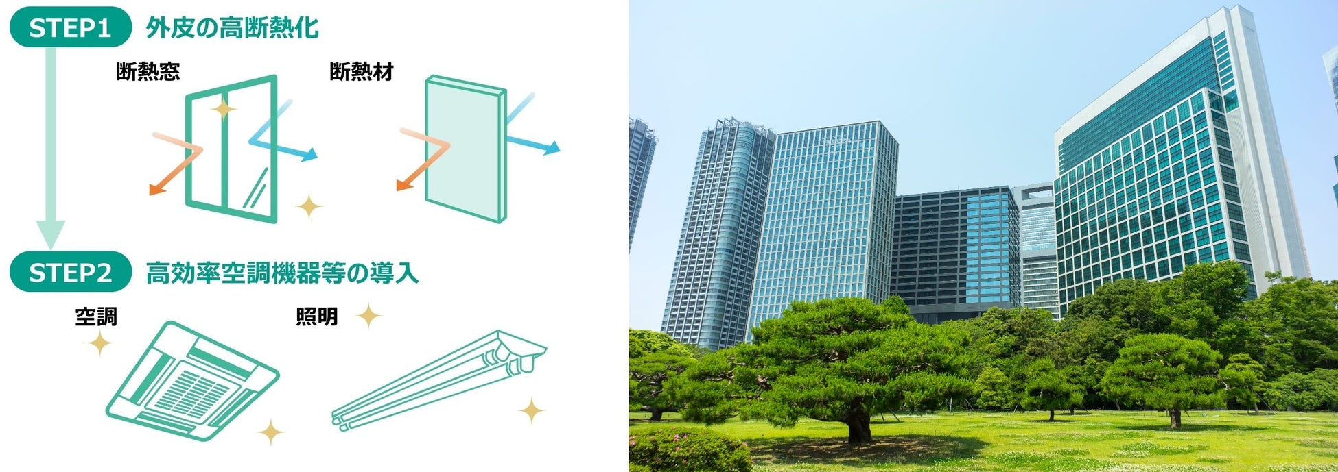既存建築物に対して「エネルギー効率の高い空調や照明、断熱性能に優れた窓や外壁」の導入を促進