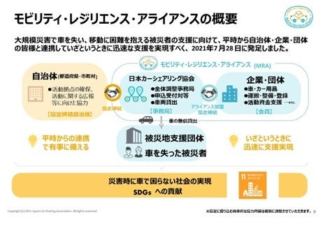 協会は、東日本大震災で甚大な被害を受けた宮城県石巻市で設立した非営利組織で、全国から寄付いただいた車を活用した生活支援や災害支援活動を行ってまいりました。2011年の活動開始以来これまで15の災害で支援活動を行い、延べ1,800件以上の車の無料貸出支援を行ってまいりました。昨今の頻発する大規模自然災害に対応するべく、2020年には佐賀県武雄市に九州支部を設立し、2021年には災害支援協定を締結する企業・団体らと災害時に車で困らない社会づくりを目指す支援ネットワーク「モビリティ・レジリエンス・アライアンス」を発足致しました。