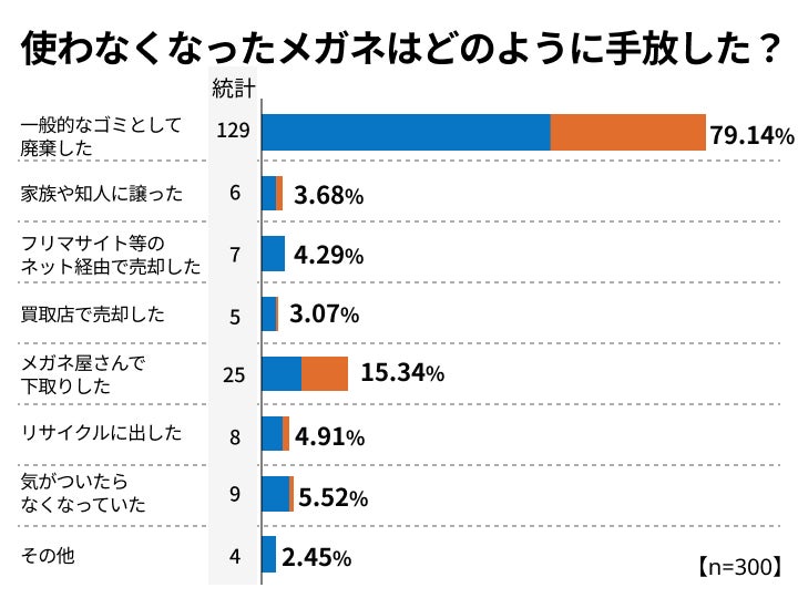 不要になったメガネについての設問では、メガネユーザーの79.1%はゴミとして廃棄していると回答。