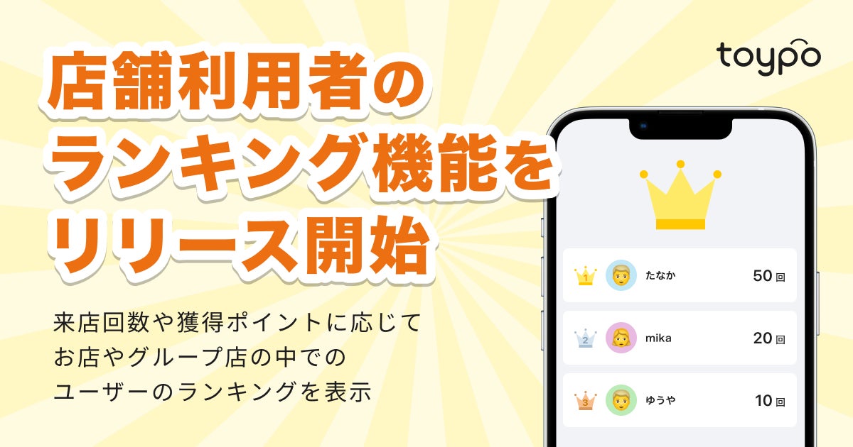 株式会社トイポ(福岡市中央区、代表取締役:村岡 拓也、以下「トイポ」)は、運営するアプリやLINEを活用した店舗向けリピーター集客サービス「toypo(トイポ)」において「店舗利用者のランキング機能」のリリースを開始しました。
