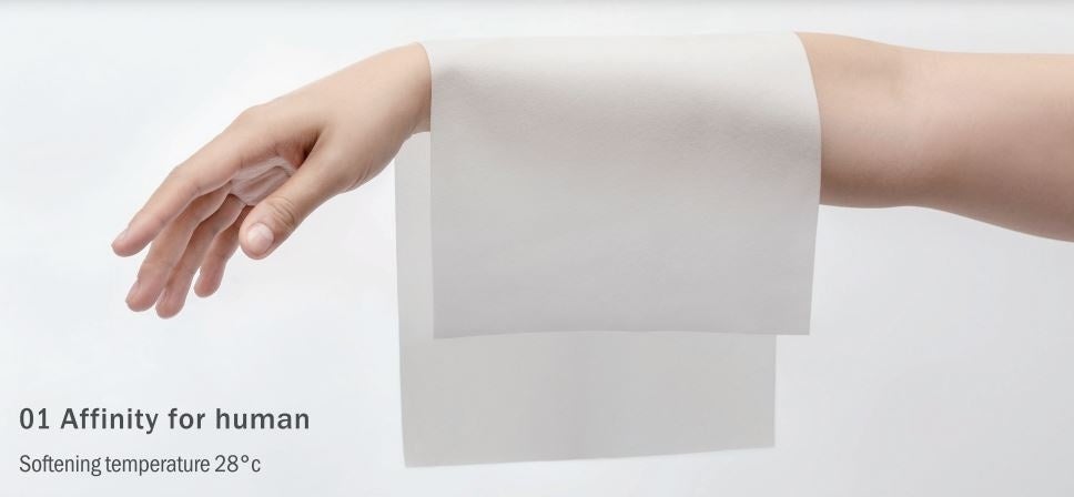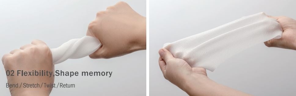 【HUMOFIT®(ヒューモフィット)】は温度依存性があり、加温すると柔らかくなり変形しやすくなる特性を持っています。くわえて形状記憶性もあり、力が緩むとゆっくりと元の形状に戻ります。