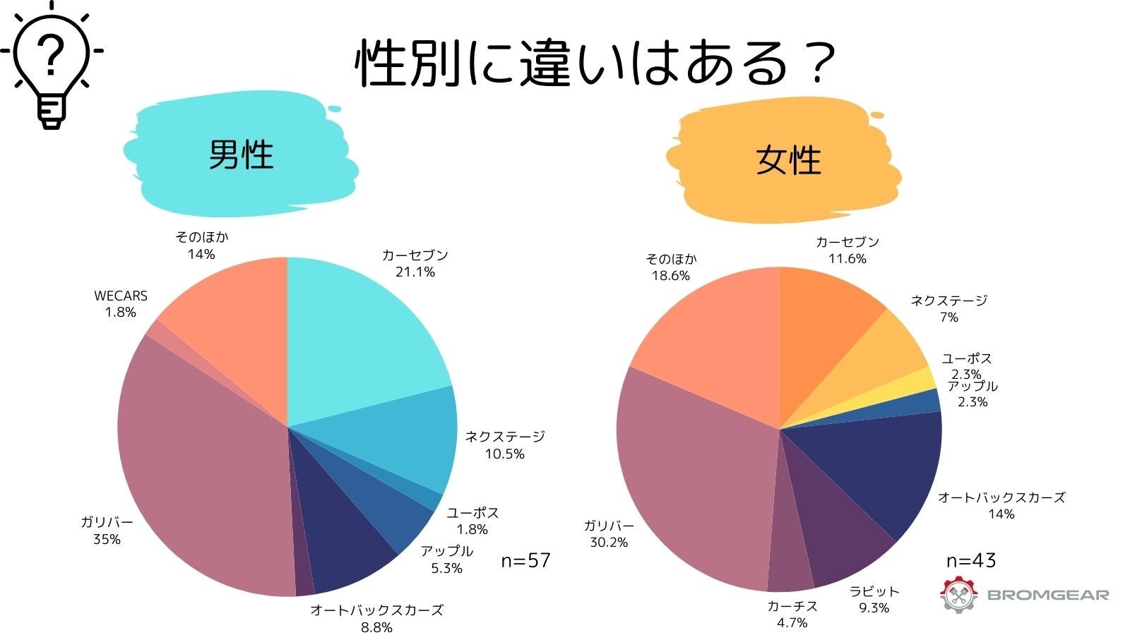 男女100名に「車を売却するときに使う買い取り業者」についてアンケートを取ってみると、1位はガリバー、2位はカーセブン、3位はオートバックスカーズという結果になりました。